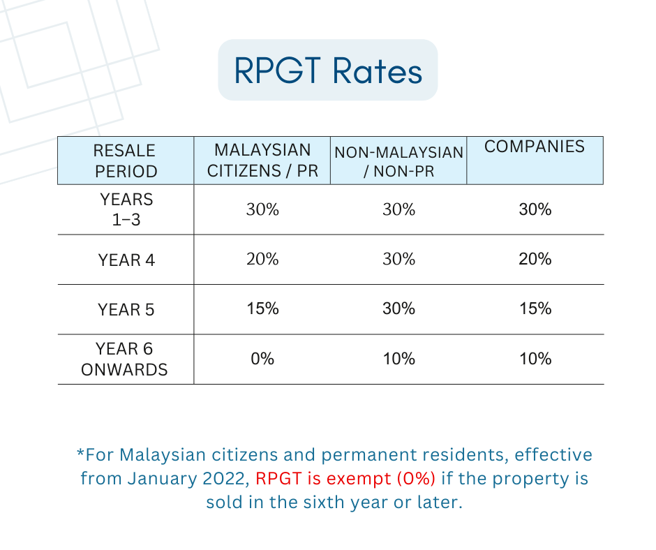 | When one disposes its property at a profit, RPGT will be imposed. However, starting of 2022, RPGT has been exempted for Malaysia citizen’s individual ownership longer than 5 years. |